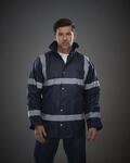 Fully waterproof and windproof security jacket, PU coated nylon outer fabric with 190g quilted padding and nylon lining, Heavy duty zip with studded storm flap, Twon outer pockets with over flaps, Elasticated knitted storm cuffs in the sleeve ends, Step collar with a concealed integral hood, Inside breast pocket, Stitched and taped seams to ensure waterproofing